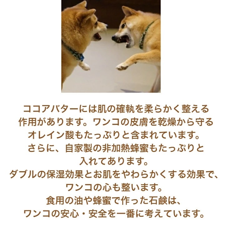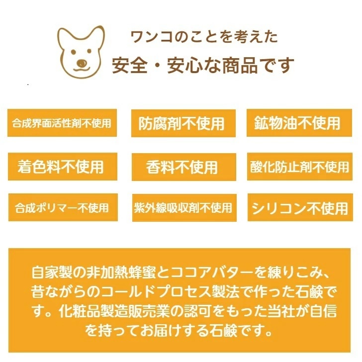 | 特長 | 自家製の非加熱蜂蜜とココアバターをたっぷりと練りこみ、コールドプロセス製法で1か月半かけてじっくりと作った犬用石鹸です。 ココアバターと蜂蜜の持つ保湿成分が、ワンコの全身にいきわたります。 また、皮膚を守る効果もあるので、お肌の弱いワンコには最適です。 洗いすぎず、環境にも優しい石鹸は、ワンコの強い味方です。 |