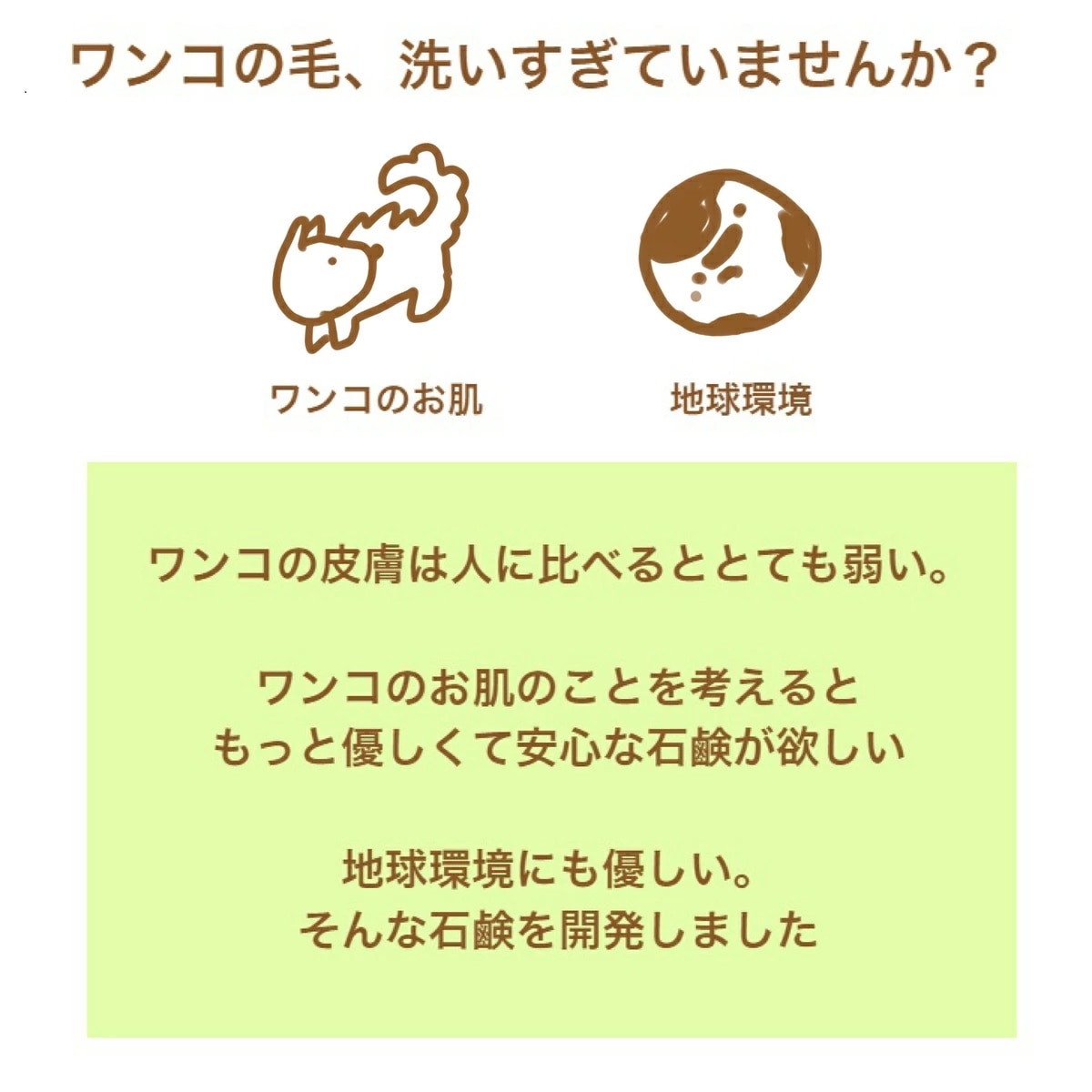 | 使用方法 | ワンコの毛をシャワーなどで十分にぬらす。 泡立てスポンジかネットを用いて本品を泡立てて使う。 |