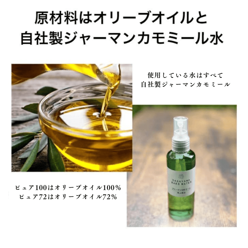 • ピュア100:オリーブ果実油、カミツレ水、水酸化Na